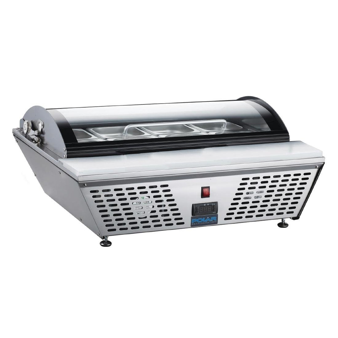 Un comptoir réfrigéré élégant, idéal pour garder les ingrédients ou les garnitures au frais et faciles d'accès. Comprend une planche à découper/de préparation intégrée et un élégant couvercle à charnière en verre incurvé.