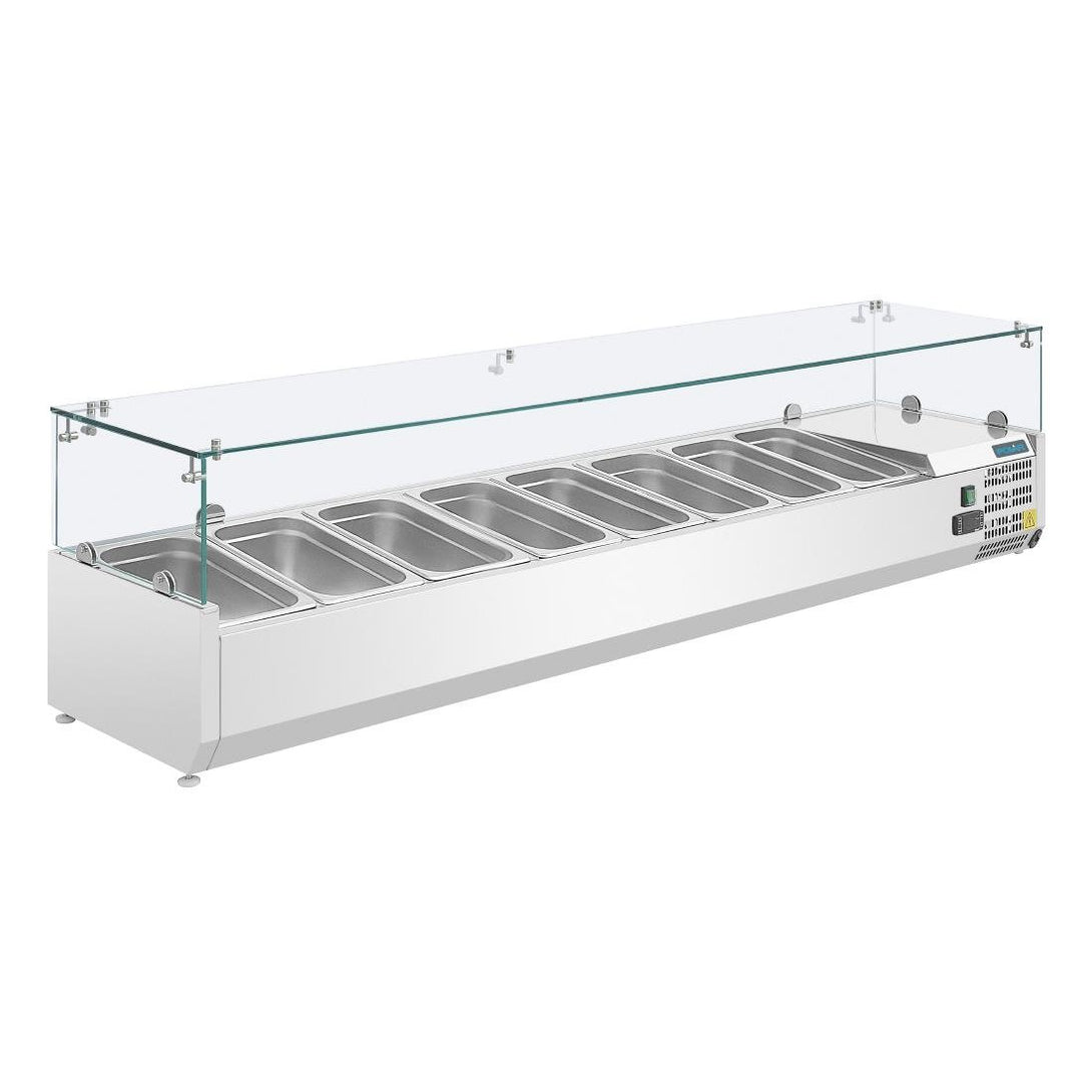 Vitrines réfrigérées polyvalentes équipées de glaces de protection. Acceptent les bacs GN 1/4 ou 1/3 jusqu'à 100mm de profondeur. 4 longueurs disponibles. Bacs gastronorme et couvercles vendus séparément.