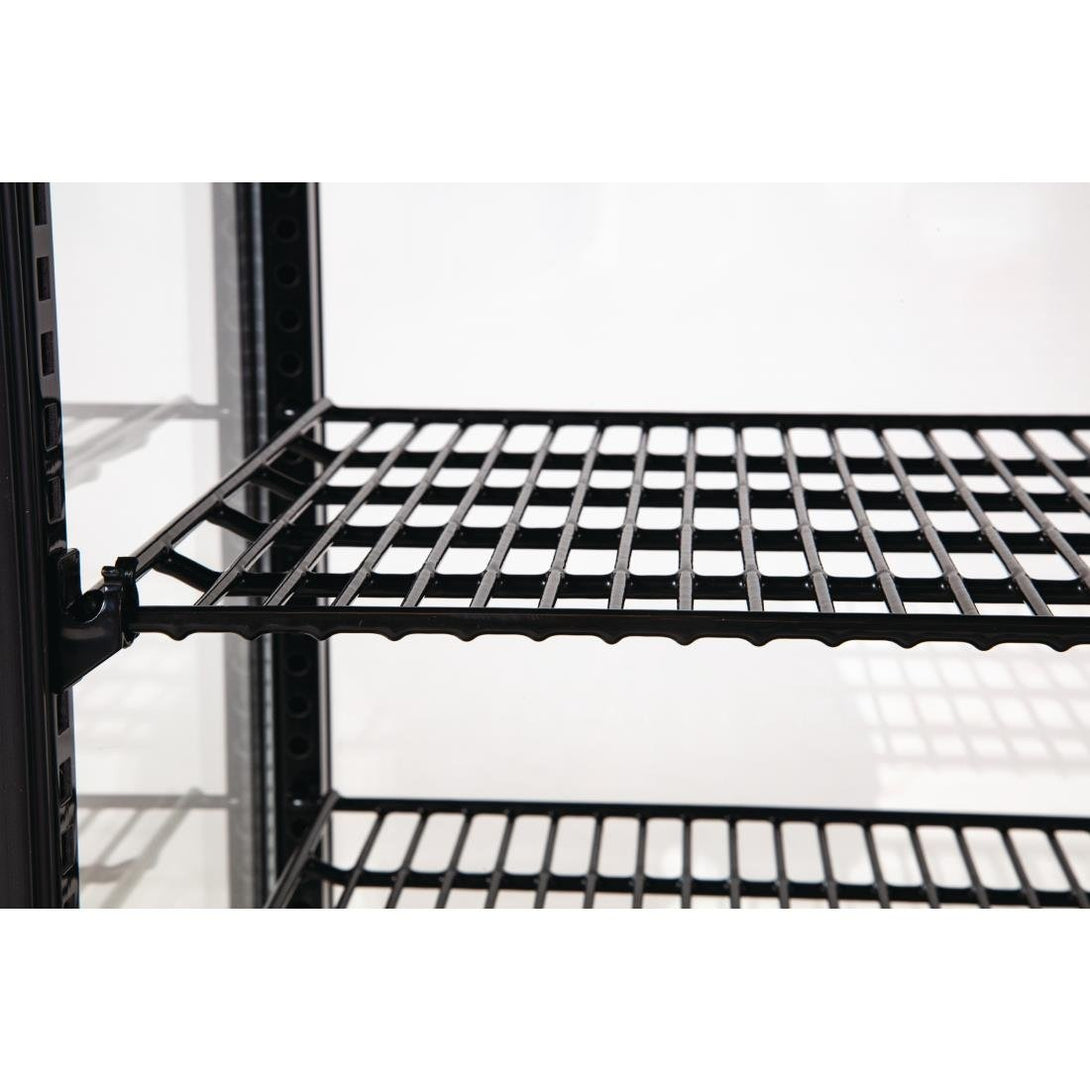 Vitrine noire peu encombrante, conçue pour économiser l'énergie. Trois étagères réglables offrent jusqu'à 68 litres d'espace de présentation réfrigérée pour les aliments et les boissons.